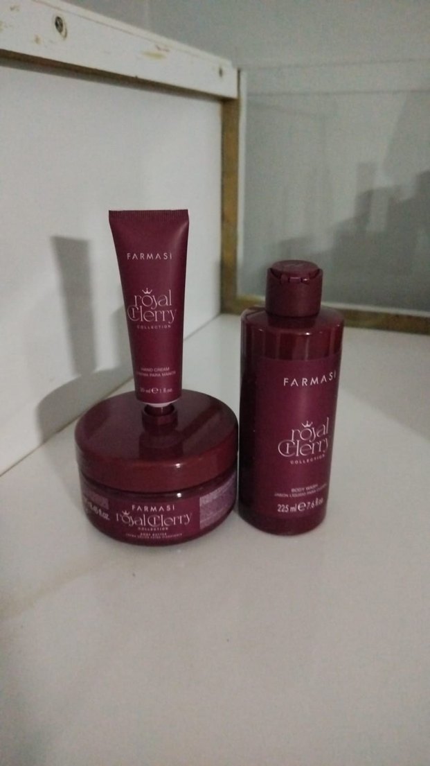 Farmasi Royal Cherry saç bakım seti, yumuşak ve besleyici saçlar için saç kremi, maske ve bakım ürünü içerir.
