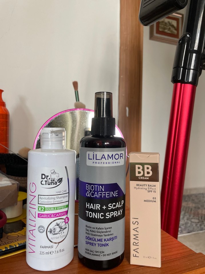 Farmasi'nin sarımsak ve kaprilil içeren canlandırıcı şampuanı, Lilamor biotin ve kafeinli saç ve saç derisi sprey tonik ile SPF 15 korumalı Farmasi BB krem orta ton içerir.