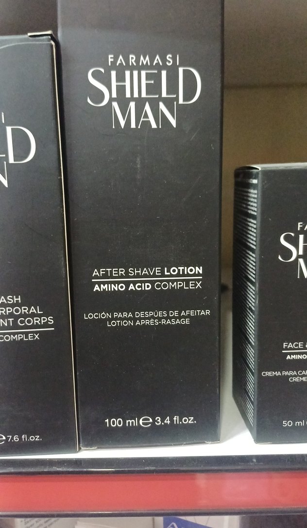 Farmasi Shield Man tıraş sonrası losyon, amino asit kompleksi ile cildi yatıştırır ve ferahlatır. 100 ml şişede sunulur.