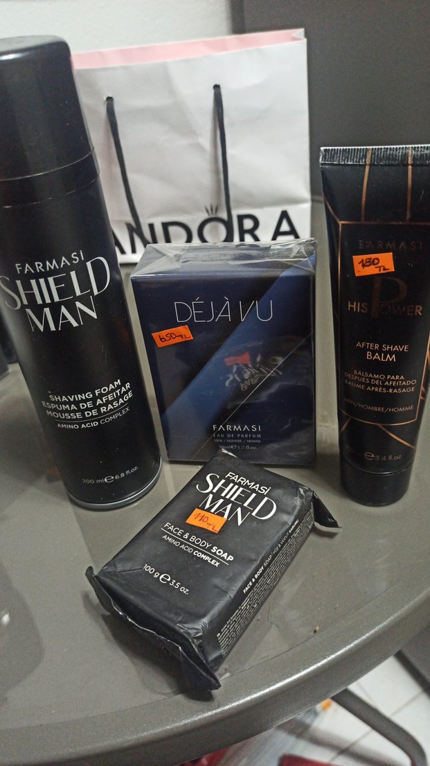 Farmasi Shield Man seti, tıraş köpüğü, tıraş sonrası balsam, yüz ve vücut sabunu ile Déjàvu parfümü içerir. Erkek bakımına yönelik ürünler