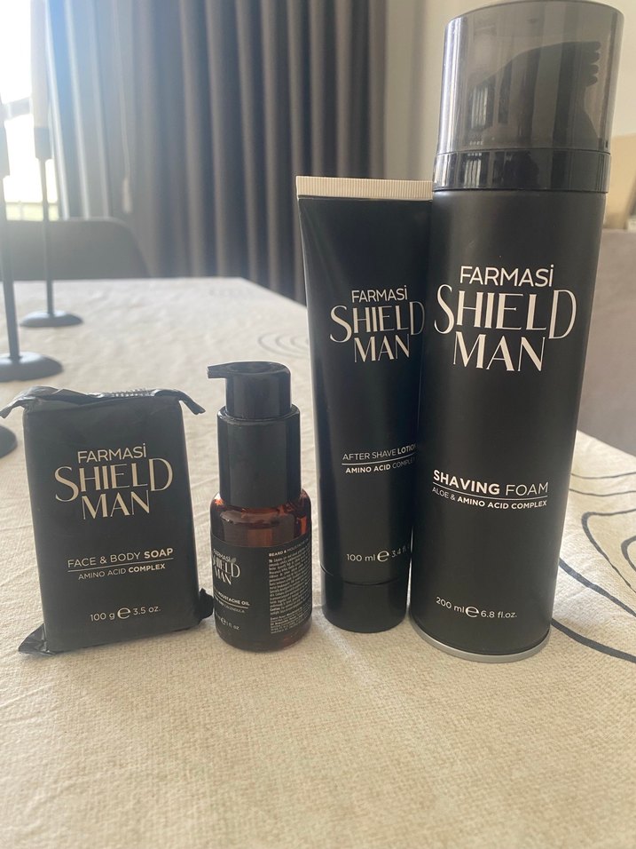 Farmasi Shield Man erkek bakım seti, amino asit kompleksi içeren yüz ve vücut sabunu, tıraş sonrası losyon, tıraş köpüğü ve serum içerir.