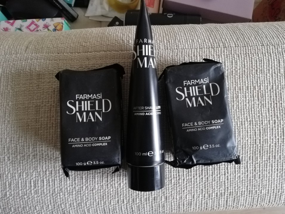 Farmasi Shield Man erkek cilt bakım seti, amino asit kompleksli yüz ve vücut sabunu ile tıraş sonrası losyon içerir.