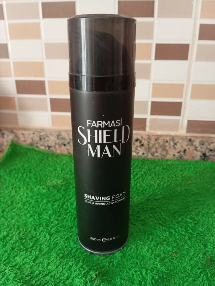 Farmasi Shield Man tıraş köpüğü, aloe ve amino asit kompleksi içerir. 200 ml siyah şişede sunulur.