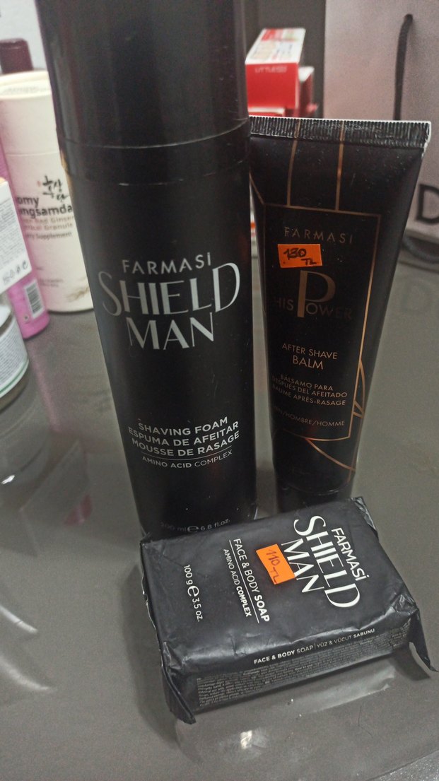 Farmasi Shield Man seti, tıraş köpüğü, tıraş sonrası balsam ve yüz & vücut sabunu içerir. Erkekler için eksiksiz bakım sağlar.