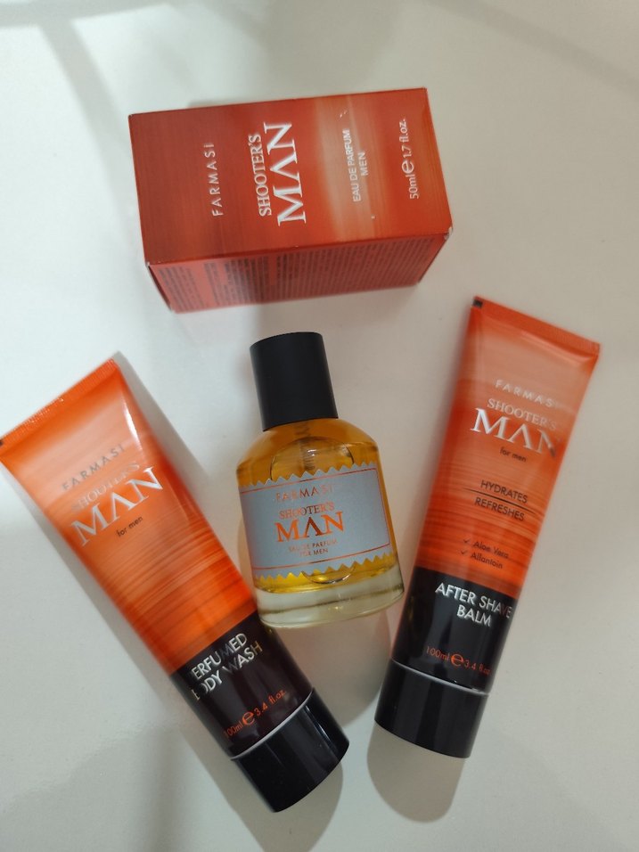 Farmasi Shooter's Man seti, ferahlatıcı vücut yıkama jeli, tıraş sonrası balsam ve parfüm içerir. Cildi nemlendirir ve canlandırır.