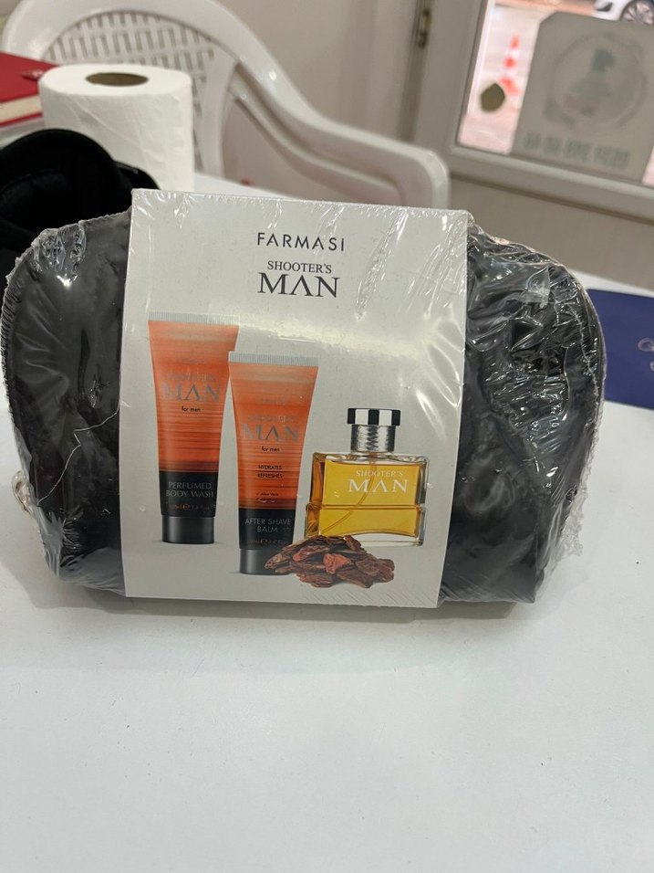 Farmasi Shooter's Man seti, koyu renkli, çağdaş erkek parfümü ve tamamlayıcı bakım ürünleri içerir. Minimalist siyah çantada sunulur.