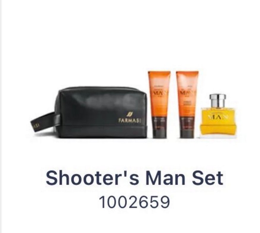 Farmasi Shooter's Man Set, minimalist tarzda koyu camel renkte erkek parfümü ve iki bakım ürününü siyah bir çanta içinde sunar. Kutulu ve dolu üründür.