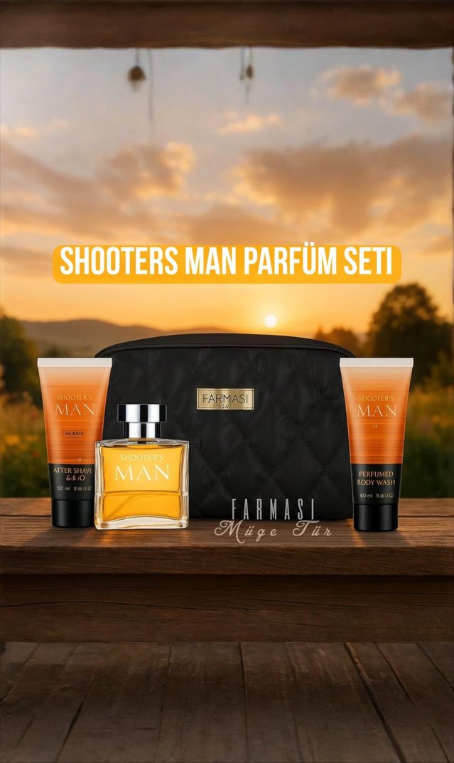 Farmasi Shooters Man seti, erkek parfümü, tıraş sonrası losyon ve parfümlü vücut yıkama içerir; siyah kapitone çantada sunulur.