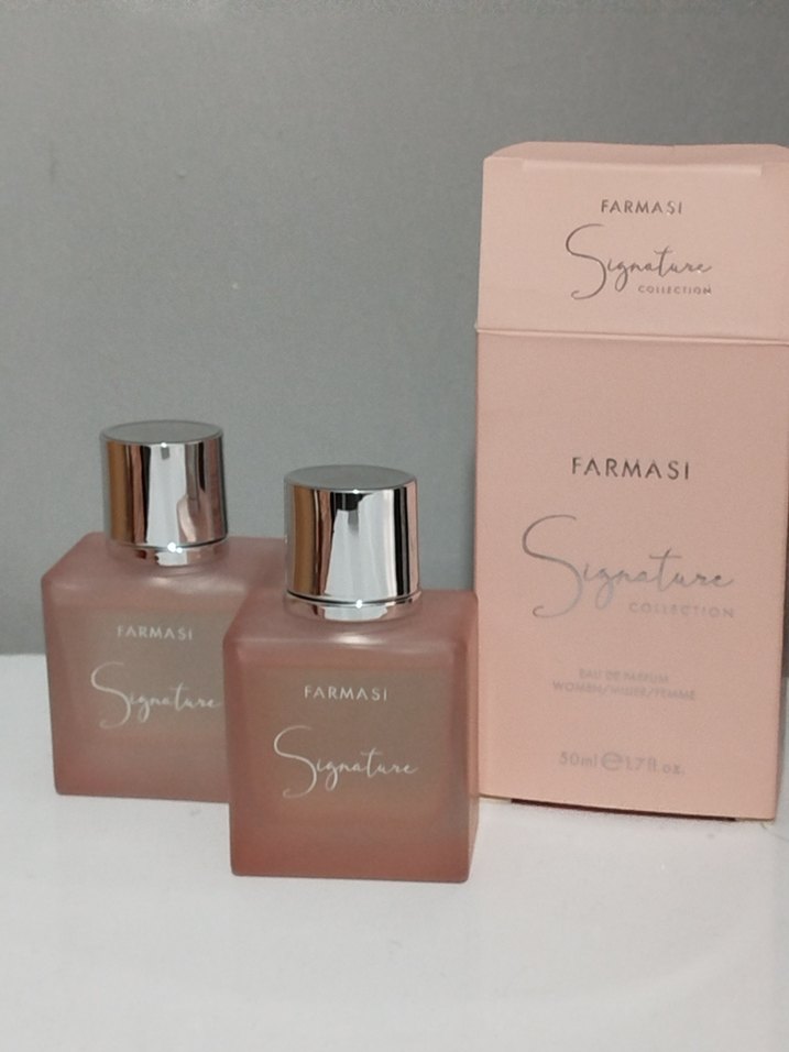 Farmasi Signature Collection kadın parfümü, 50 ml şişede, yumuşak pembe tasarım ve gümüş kapaklıdır. Zarif ve hafif bir koku sunar.