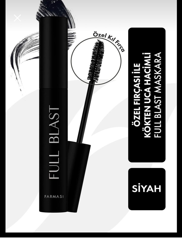 Farmasi siyah Full Blast maskara, özel kıllı fırçasıyla kirpikleri kökten hacimli gösterir.