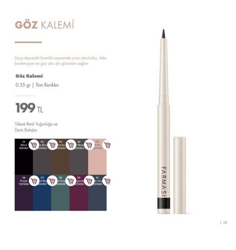 Farmasi siyah göz kalemi, uzun süre kalıcı, leke yapmayan yoğun renk sağlar. Pürüzsüz dokusuyla kolay uygulanır.