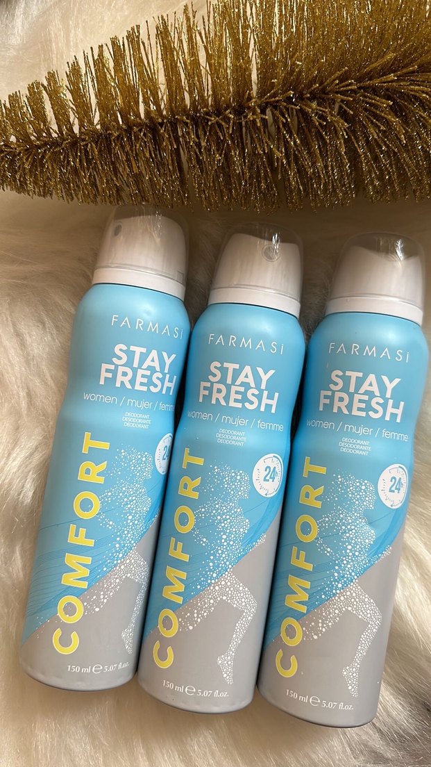Farmasi Stay Fresh Comfort kadın deodorant, 24 saat ferahlık ve konfor sağlar. Hafif, ferahlatıcı kokuya sahip, 150 ml sprey şişe.