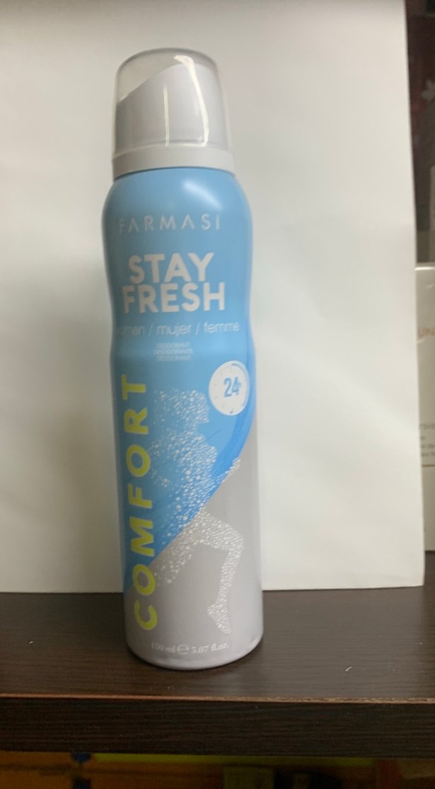 Farmasi Stay Fresh kadın deodorant, 24 saat ferahlık ve konfor sağlar. Hafif ve yumuşak formüle sahip, 150 ml sprey şişe.