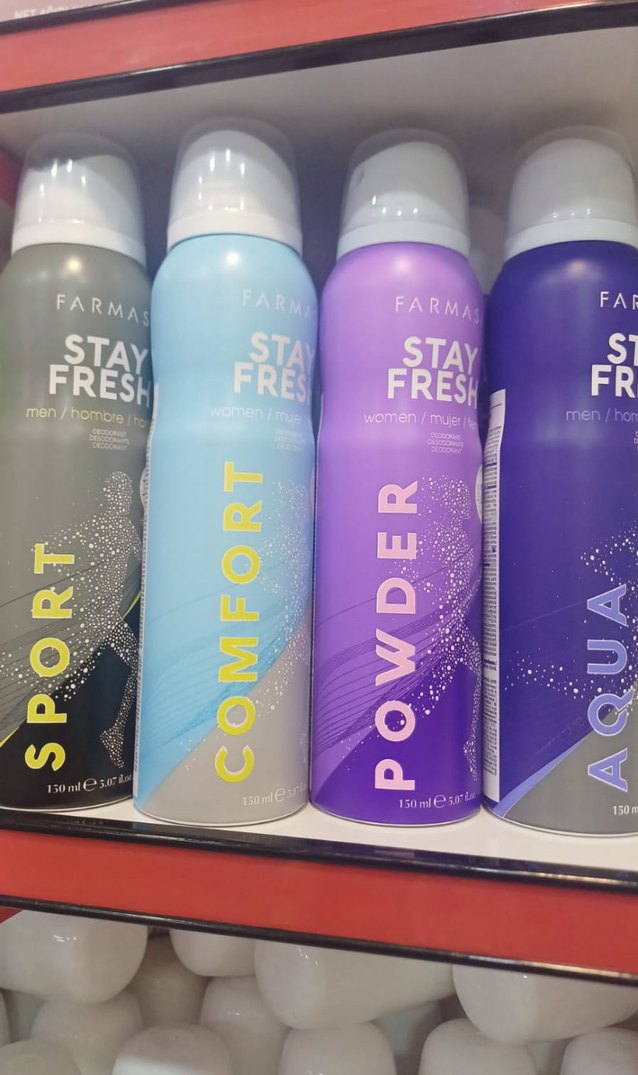 Farmasi Stay Fresh kadın deodorantları, Comfort ve Powder gibi çeşitli kokularda 150 ml'lik kutularda ferahlık sağlar. Kadın ve erkek deodorantları elimde mevcut adet fiyatıdır