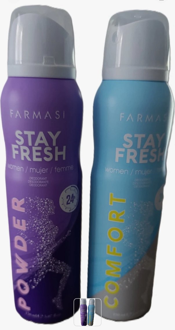 Farmasi Stay Fresh kadın deodorantları, 24 saat kalıcı ferahlık sağlar. Pudra ve konfor kokularıyla nazik formüllere sahiptir. 2 Li fiyatıdır
