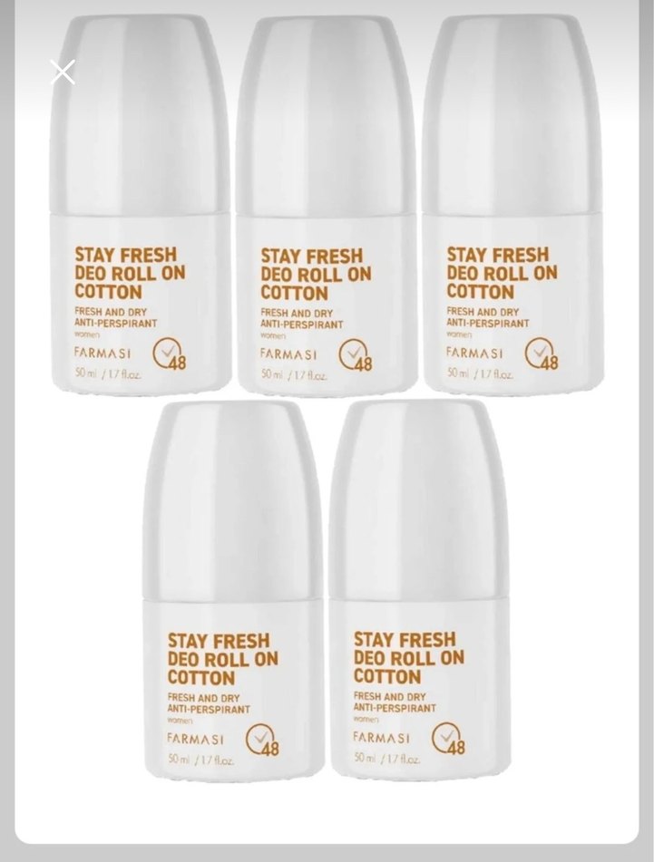 Farmasi Stay Fresh pamuk kokulu roll-on deodorant, 48 saat tazelik ve terlemeye karşı koruma sağlar. Kuru ve ferah koltuk altları için idealdir. Farmasi cotton roll on 5 adet