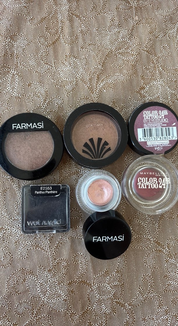 Farmasi , koton, wetn wild, Maybelline markalı koyu bej tonlarında göz farları seti, canlı renkler ve kalıcı formüller içerir. İlgilendiğiniz ürün için fiyat sorabilirsiniz