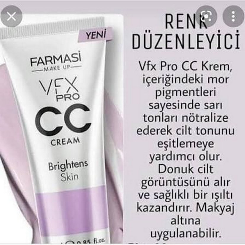 Farmasi Vfx Pro CC Krem, pigment içeriğiyle cilt tonlarını nötralize eder ve cildi aydınlatır. Cilt tonunu eşitler, donuk görünümü azaltır ve sağlıklı bir görünüm kazandırır. Makyaj altına uygulanabilir.