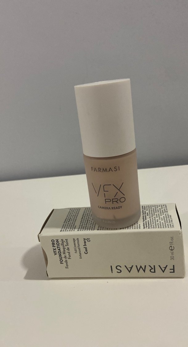 Farmasi VFX Pro fondöten, pastel bej tonunda, kamera hazır görünüm sağlar. Şişe ve kutuda net marka yazıları bulunur.
