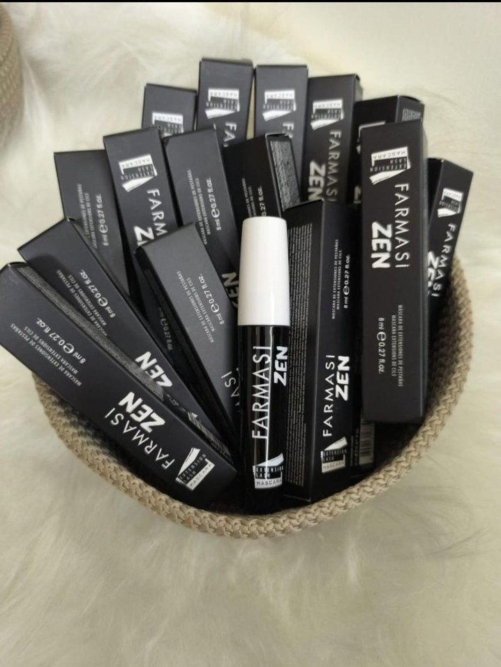 Farmasi Zen siyah maskara, kirpiklere koyu ve canlı bir renk verir. Ambalajda 'FARMASI ZEN' yazısı bulunur.