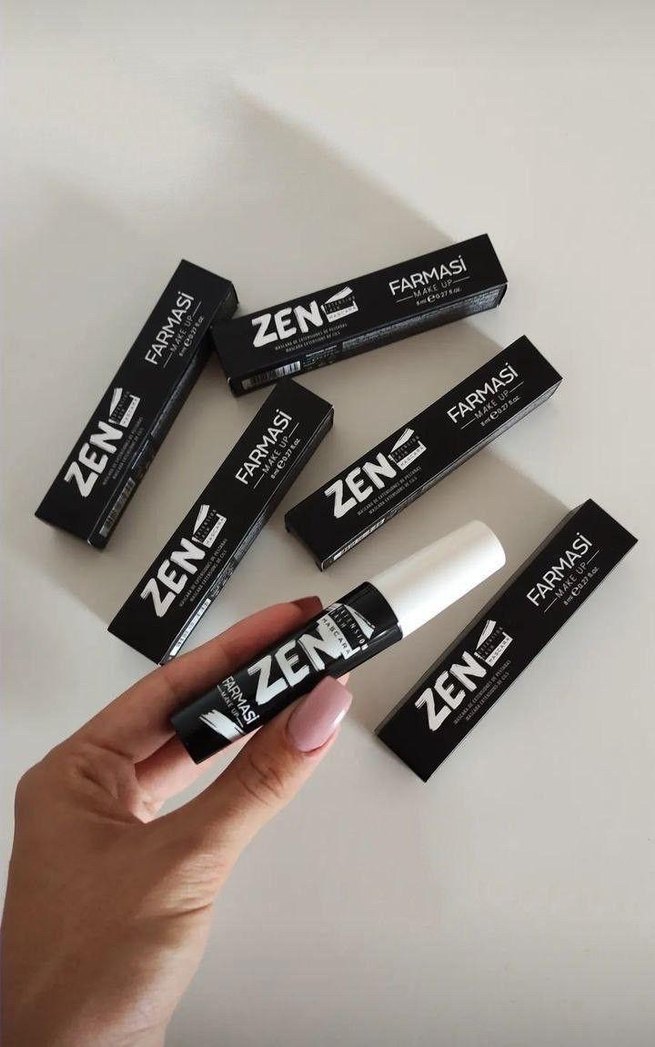 Farmasi Zen siyah maskara, koyu ve canlı renklerle yoğun hacim sağlar. Ambalajda 'ZEN' logosu yer alır.