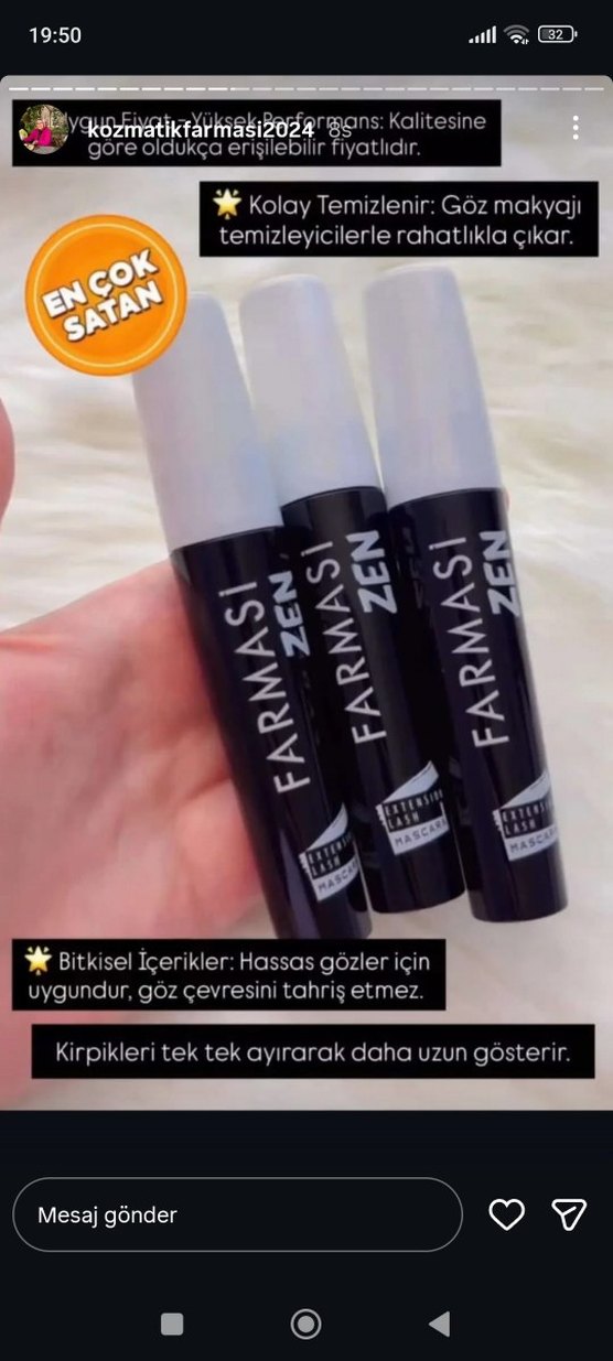 Farmasi Zen siyah maskara, kirpikleri tek tek ayırarak daha uzun gösterir. Bitkisel içerikler hassas gözler için uygundur, göz çevresini tahriş etmez.