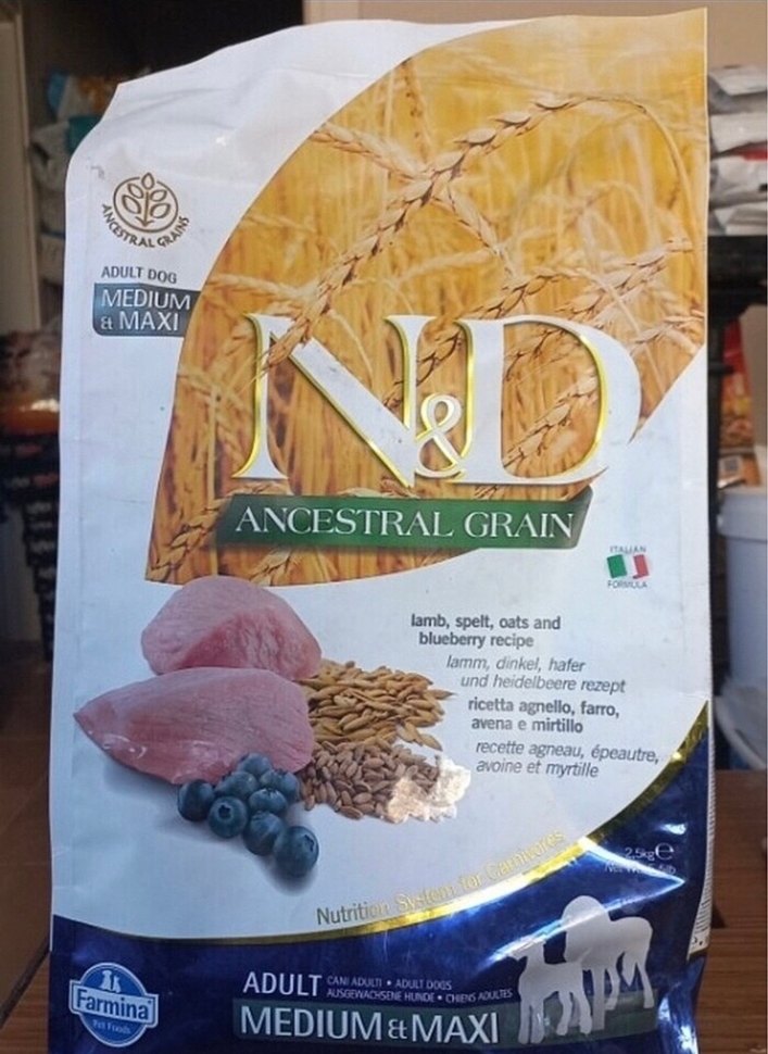 Farmina N&D Ancestral Grain yetişkin orta ve büyük ırk köpekler için kuzu, arpa, yulaf ve yaban mersini tarifi içerir.