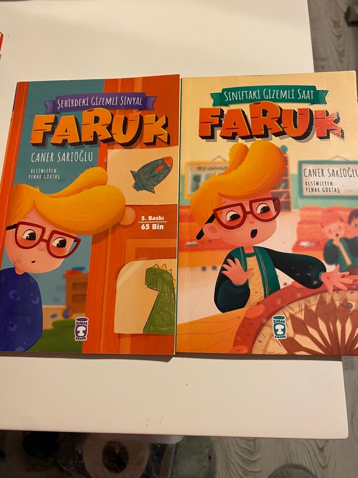 Caner Sarıoğlu'nun Faruk karakterli iki çocuk kitabı, renkli çizimler ve gizemli hikayeler içerir.