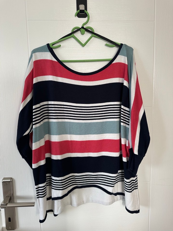 Faruk Ekin Çok Renkli Triko Tunik İnce bir trikodur. Boy olarak tayt üzerinde kullanılabilecek, tunik boyunda bir üründür. İyi durumdadır. Yakası kayık yaka şeklindedir. Standart beden bir üründür.