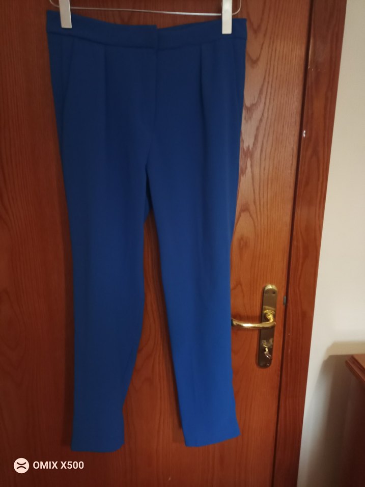 Kadınlar için mavi kumaş pantolon, normal midi boyda ve regular fit. Sentetik kumaştan, tokalı detaylı, ofis ve iş ortamı için uygun. Trendy casual tarzına uyum sağlar.