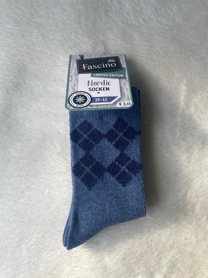 Fascino markalı, mavi ve gri renklerde Nordic desenli, normal midi boy, rahat kesim erkek çorabı. 39-42 numara aralığında.