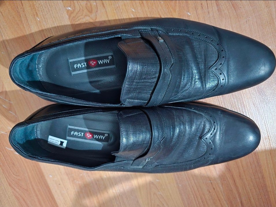çok iyi durumda 42 numara. Fast Way marka siyah erkek klasik ayakkabılar, desenli ve velcro detaylıdır. Dayanıklı kauçuk malzemeden üretilmiştir, ofis ve sokak stiline uygundur.