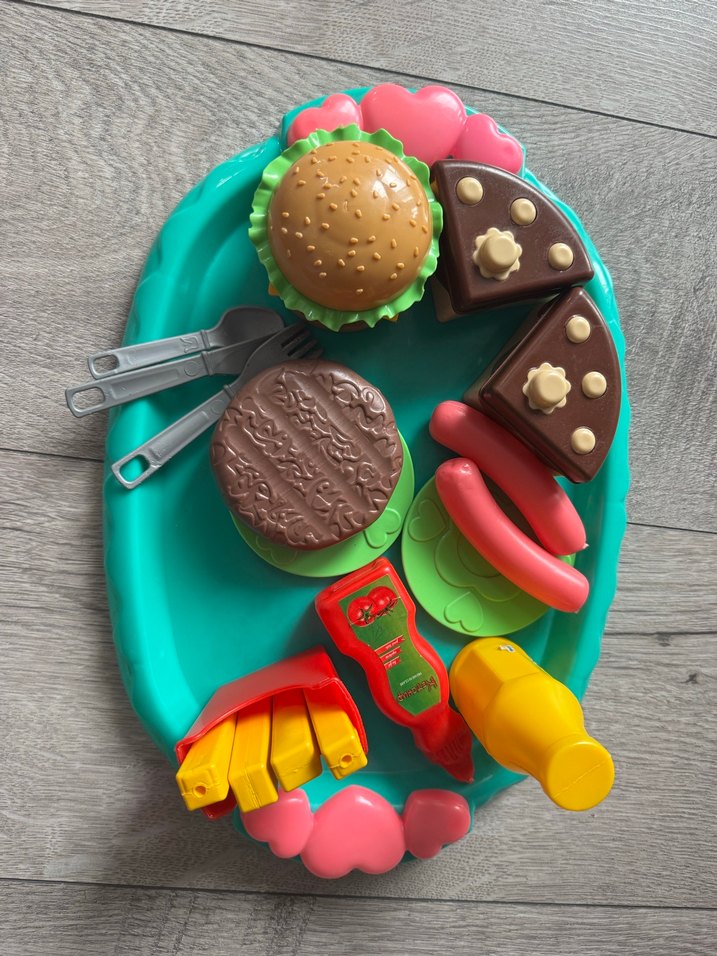Yeşil tepsi içinde hamburger, sosis, pasta dilimleri ve soslar içeren renkli oyuncak yemek seti. Hayal gücünü destekler.