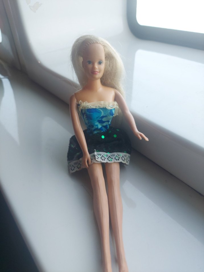 elbise orjinalmi bilmiyorum ön ve arkatarafta yırtık var dantel ve payet detaylı koyu mavi elbise giymektedir. Uzun sarı saçlı ve oturur pozisyondadır.