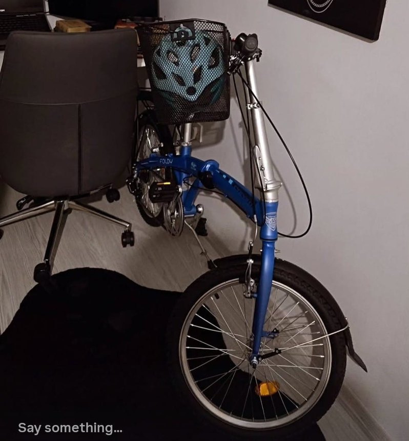 Kasklı, ön sepetli koyu mavi üç tekerlekli bisiklet. Dayanıklı gövde ve el frenlerine sahiptir.