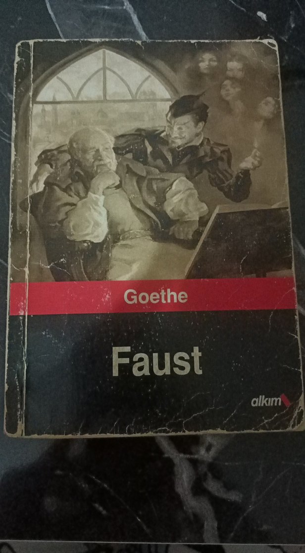 Goethe'nin Faust adlı klasik romanı, derin felsefi temalar içerir. Alkim yayınevi tarafından basılmıştır, kapağında önemli karakterlerin resmi bulunur.
