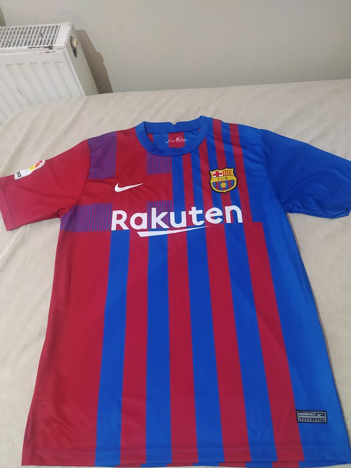 FC Barcelona erkek forması, kısa kollu, yuvarlak yakalı ve bol kesimdir. Sentetik kumaştan, örme dokuda ve kırmızı-mavi baskılı çizgili desene sahiptir. Önünde Rakuten logosu bulunur. ⚽