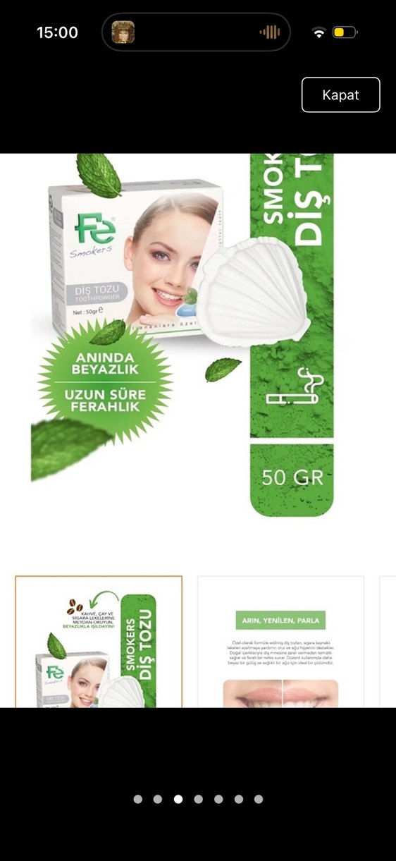 FE Smokers diş tozu, anında beyazlık ve uzun süre ferahlık sağlar. Dişlerinizi temizler, yeniler ve parlaklık kazandırır. 50 gramlık pakette sunulur.