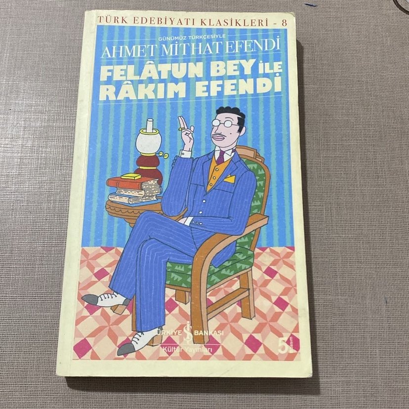 Ahmet Mithat Efendi'nin klasik Türk edebiyatı romanı 'Felâtun Bey ile Rakım Efendi.' Kapakta mavi takım elbiseli bir karakter yer alıyor.