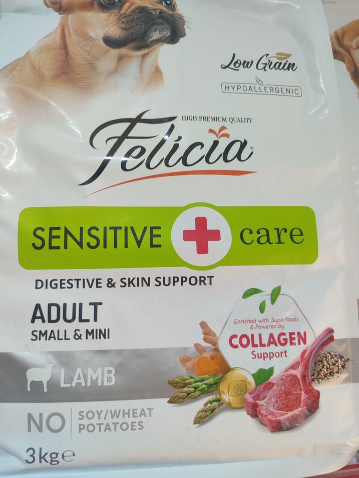 Felicia Sensitive Care köpek maması, sindirim ve cilt desteği için kolajen içerir. Hipoalerjeniktir, soya, buğday ve patates içermez, yetişkin küçük ırklar için uygundur.