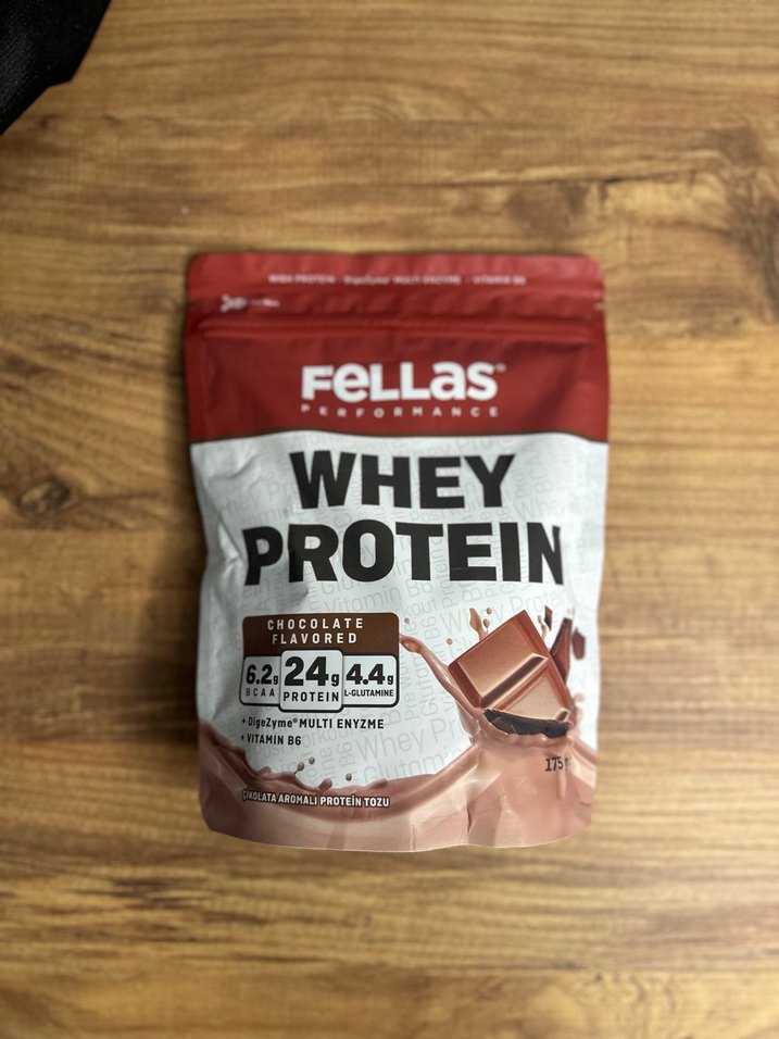 Fellas Whey Protein çikolata aromalı, 24g protein, multi enzim ve B6 vitamini içerir. Toz koyu kahverengidir ve performans içindir.