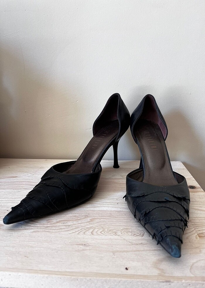 37 numara siyah 8,5 cm ince topuklu Fellini italyan marka gerçek deri topuklu ayakkabı. biraz burnu deformedir harici bir sorunu yoktur.