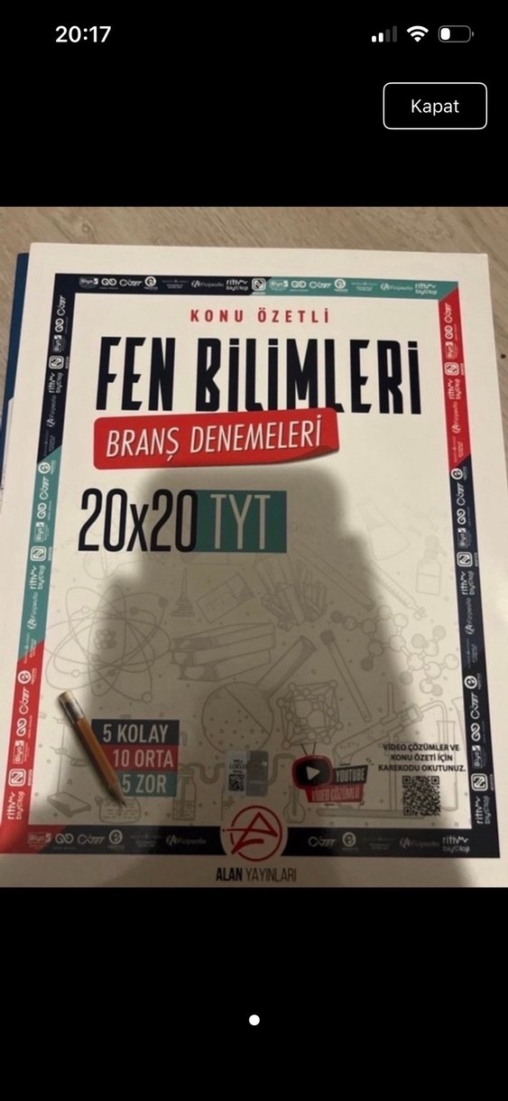 Fen Bilimleri branş denemeleri içeren, 5 kolay, 10 orta ve 5 zor testten oluşan 20x20 TYT sınav kitabı.
