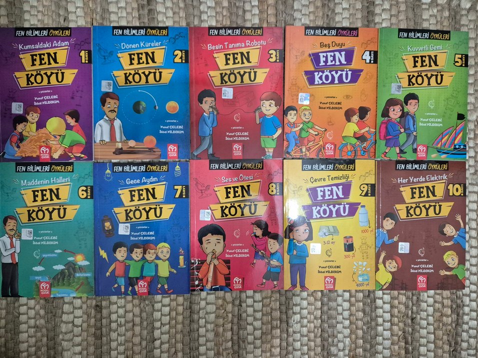 Fen Köyü serisinden gezegenler, besin tanıma robotu, beş duyu, gece, ses ve ötesi ile çevre temizliği konularını içeren altı çocuk kitabı seti. Eğitici ve resimli hikayeler. Soru kitapçığı yoktur içinde.