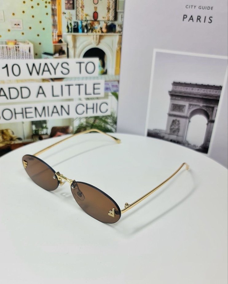 Parlak kahverengi minimalist kadın gözlüğü, tokalı detaylı ve klasik zarif sokak stili. Altın tonlu çerçeve ve kahverengi camlara sahip. ️