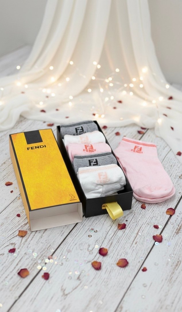 Fendi mini çoraplar, pastel pudra ve gri tonlarında, baskılı logo detaylı, kadınlar için rahat ve tam oturan bir tarza sahip. Markalı kutuda sunulur.