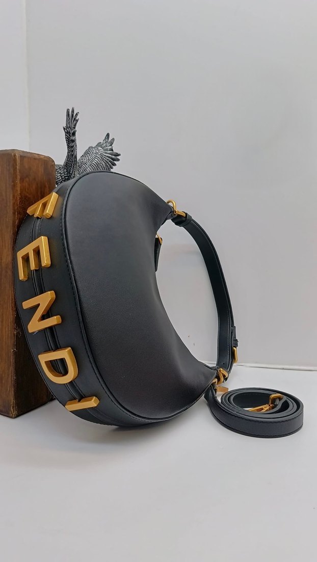 Deri çanta FENDI harfleriyle tokalı detaylara sahip. Sokak modası ve avangard tarz için uygun, günlük kullanıma ideal.