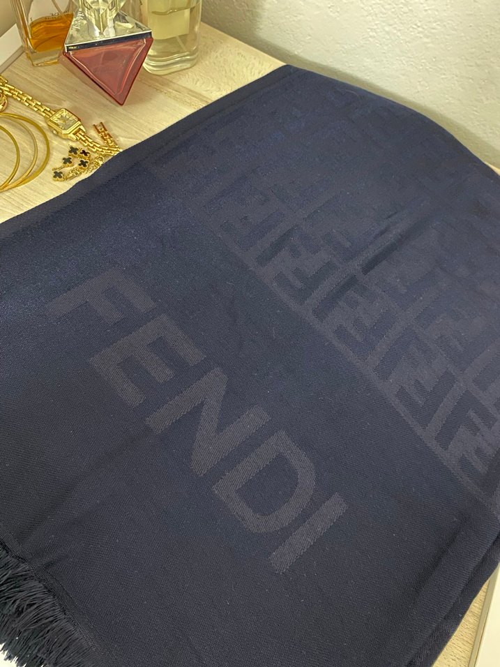 Lacivert renkte, tok duruşlu, kaşmir kumaştan yapılmış kadın şal. Fendi desenli ve püsküllü, rahat her tarz için uygun.