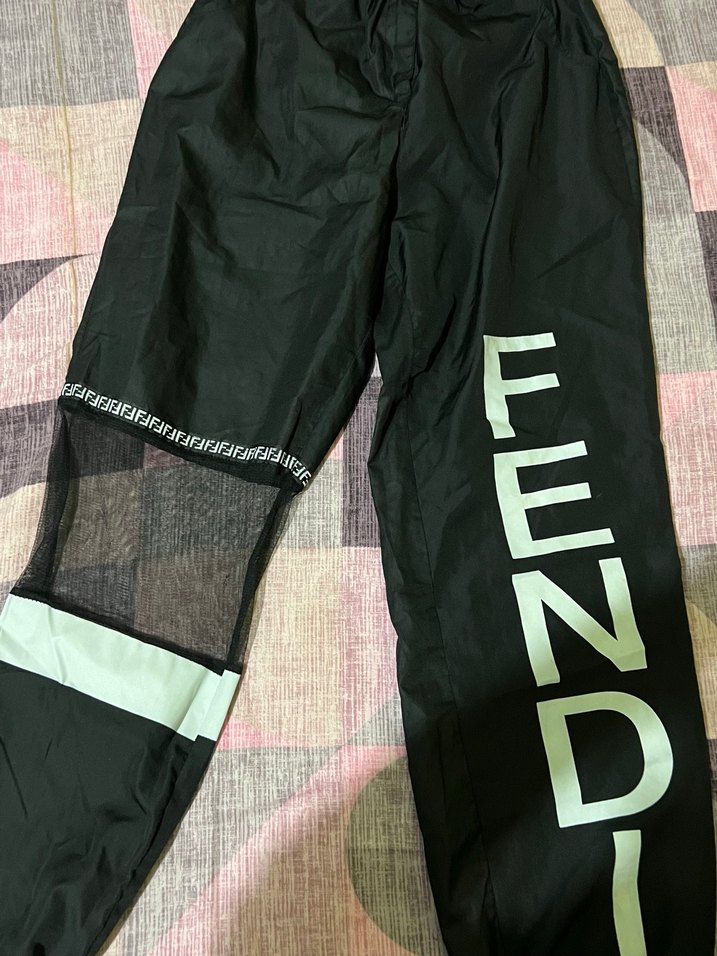 Siyah, bol kesim kadın pantolon, baskılı Fendi yazısı ve fermuar detaylarına sahip, sentetik kumaştan, dış mekan kullanımı için uygun.