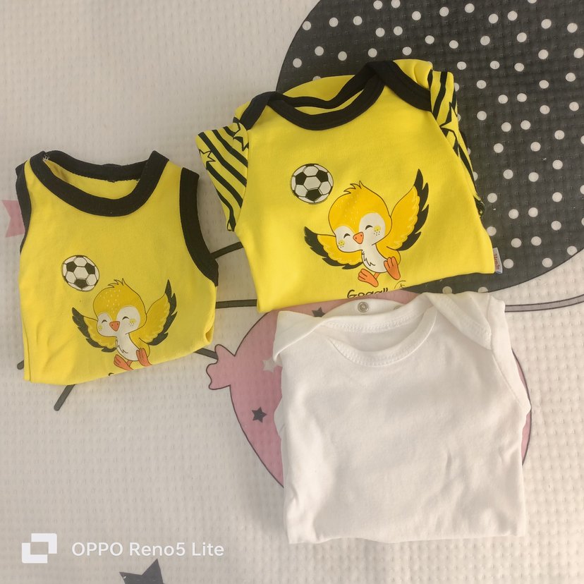 Sarı renkli, baskılı kısa kollu bebek body. Yuvarlak yaka ve düğmeli tasarıma sahip, yumuşak ve rahat kumaşlı. bundada saadece kısa kollu zıbın kullanildi